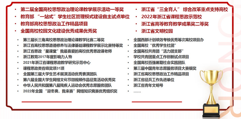 五年来,学校努力构建“大思政”格局,全面落实立德树人根本任务。学校着力推进思政课程教学改革,突出学科教学体系构建,切实提升课程的吸引力、思想性,满足学生成长成才需求。学校出台制定《浙江万里学院全面推进“大思政课”建设实施方案》等文件制度,推动思想政治理论课教学改革建设。经过探索实践,“123”思政课程教学新模式逐渐成熟见效,以学生为中心的思政课教学改革、课程教学改革团队建设、课程建设制度化体系化平台化、课程教学成果辐射成效显著。全面推进课程思政“六个一”项目建设,出台《浙江万里学院课程思政教学研究中心建设方案》等制度,推进课程思政焕发时代新机,学校获批省级首批课程思政教学研究示范中心、入选省级课程思政示范校。日常思政践行以生为本,构建起了 “一层一板四梁八柱”发展型学生工作体系。五年来,日常思政各项工作获市级以上奖项430余项。生活思政经过萌芽探索、丰富拓展期、完善成型、发展提升四个时期探索,打通了“育人最后一公里”,打开了思政育人新局,提升了学校思政育人美誉度。