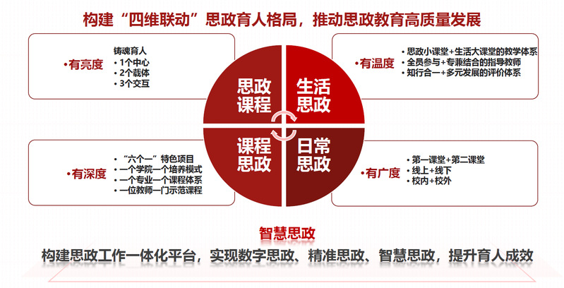 五年来,学校围绕“立德树人”根本任务,把思想政治工作贯穿教育教学全过程,通过创新工作思路,提升育人质效,构建了“思政课程、课程思政、日常思政、生活思政”四维联动的全员全过程全方位的“大思政工作新格局,推动学校思政工作取得丰硕成果。