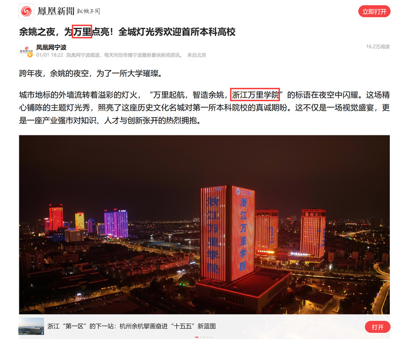 《凤凰网》余姚之夜,为万里点亮!全城灯光秀欢迎首所本科高校
